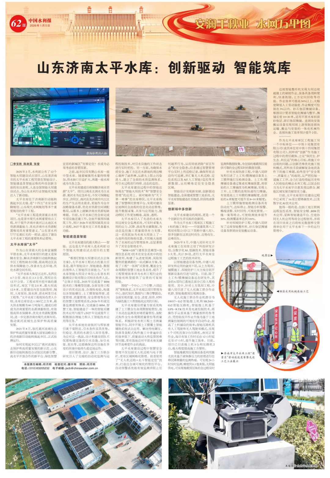 ? ? ? ?1月5日,《中國水利報(bào)》刊登的《山東濟(jì)南太平水庫:創(chuàng)新驅(qū)動(dòng) 智能筑庫》通訊稿件中,對濟(jì)南城投集團(tuán)建設(shè)的太平水庫工程的重要性以及科技創(chuàng)新方面的突出表現(xiàn)進(jìn)行了報(bào)道。